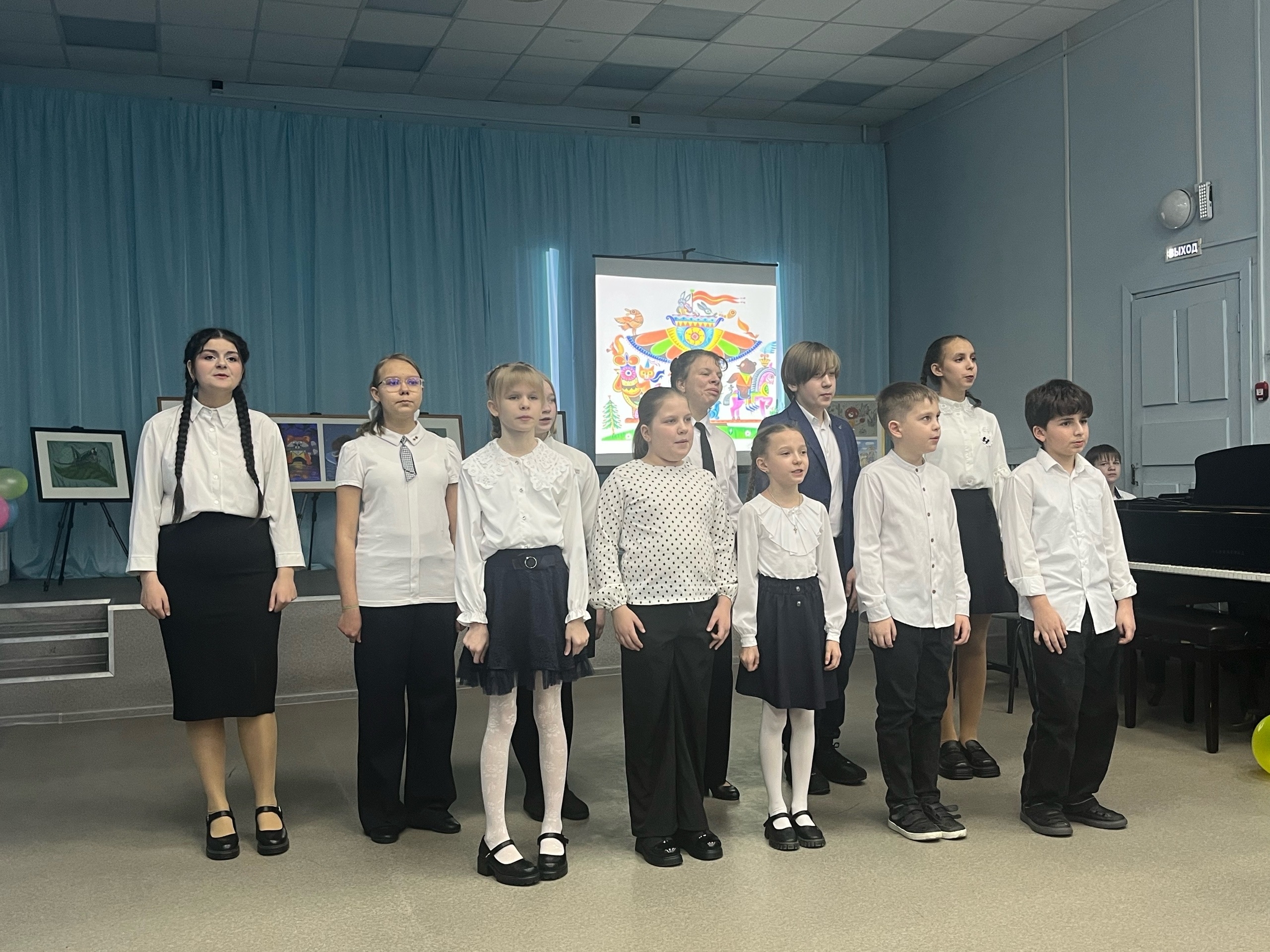 Наши юные художники представили зрителям красочную выставку работ. Они проиллюстрировали кадры из всеми любимых мультфильмов, где звучит музыка Владимира Шаинского. Чебурашка и Крокодил Гена, Кот Леопольд, озорной Антошка и другие герои ожили на детских рисунках, создав по-настоящему волшебную атмосферу.
